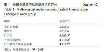實(shí)驗(yàn)選用新西蘭白兔50只,分為 5組,實(shí)驗(yàn)過程無脫失,全部進(jìn)入結(jié)果分析??瞻讓?duì)照組膝關(guān)節(jié)軟骨無明顯 磨損, 周圍滑膜無明顯增生及炎性改變。模型組液組膝關(guān) 節(jié)磨損較為嚴(yán)重,軟骨破壞達(dá)到3級(jí),但并未暴露軟骨下骨, 周圍滑膜增生及炎性改變較為明顯。針刀組、丹參注射液 組、針刀聯(lián)合丹參注射液組膝關(guān)節(jié)輕度磨損,1級(jí)到2級(jí), 周圍滑膜增生及炎性改變不明顯,兩組在大體觀下無法辨 別磨損嚴(yán)重程度的差異??瞻讓?duì)照組 軟骨表明光滑、軟骨細(xì)胞梭形排列,形態(tài)、數(shù)目、結(jié)構(gòu)基 本正常,無血管翳生成;模型組表層軟骨細(xì)胞明顯減少, 細(xì)胞排列紊亂;針刀組軟骨表層較為光滑、軟骨細(xì)胞數(shù)目 結(jié)構(gòu)基本正常;丹參注射液組軟骨表層光滑、軟骨細(xì)胞排 列輕度紊亂,局部缺損;針刀聯(lián)合丹參注射液組軟骨表層 較為光滑,軟骨細(xì)胞數(shù)量結(jié)構(gòu)基本正常。見圖1。病理切片 評(píng)分,丹參注射液組評(píng)分略高于針刀組和針刀聯(lián)合丹參注 射液組,但此3組之間差異無顯著性意義。見表1。