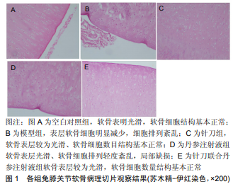 將50只健康新西蘭白兔隨機(jī) 分為5組進(jìn)行實(shí)驗(yàn):空白對(duì)照組、模型組、單純丹參注射液 組、單純閉合針刀松解組(針刀組)、閉合針刀松解結(jié)合丹參 注射液組關(guān)節(jié)腔注射組(針刀聯(lián)合丹參注射液組),每組各10 只。所有動(dòng)物同等條件下飼養(yǎng)1周,穩(wěn)定后,除空白對(duì)照組 外其他4組兔均參考張子峰等報(bào)道的方法造模:將兔取左 側(cè)臥位,于右側(cè)髖關(guān)節(jié)大轉(zhuǎn)子后約1 cm處為中點(diǎn),上下直切 口3 cm,分離髂內(nèi)靜脈屬支臀下靜脈,雙重結(jié)扎,結(jié)扎線 間切斷。仰臥位,右側(cè)腹股溝觸及動(dòng)脈搏動(dòng)處作1 cm縱形切 口,分別分離股靜脈、大隱靜脈,分別雙重結(jié)扎后于結(jié)扎線 間切斷。于右側(cè)膝關(guān)節(jié)間隙水平切斷腓腸肌內(nèi)、外側(cè)頭,切 除5 mm長(zhǎng)一段跟腱。所有手術(shù)切口縫合皮下組織、皮膚后 敷蓋乙醇紗布、棉墊。造模后連續(xù)3 d注射青霉素5 U/(kg•d)、 鏈霉素10×104 U/(kg•d),所有動(dòng)物分籠飼養(yǎng)。造模后每日驅(qū) 趕動(dòng)物活動(dòng)2 h,共驅(qū)趕動(dòng)物2周,2周后動(dòng)物出現(xiàn)關(guān)節(jié)僵硬、 瘸行,關(guān)節(jié)周圍可觸及條索結(jié)節(jié),X射線片顯示下肢力線 右外翻10°變?yōu)閮?nèi)翻,提示造模成功。