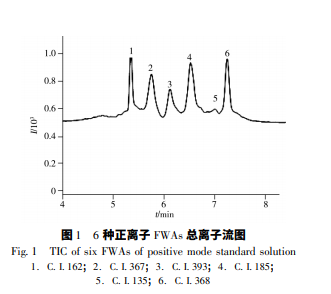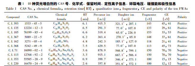 6460 三重四極桿液質(zhì)聯(lián)用儀( 美國(guó)安捷倫公司) ; 5810R 冷凍離心機(jī)( 德國(guó)艾本德股份公司) ; R - 12 平行溶劑濃縮蒸發(fā)儀( 瑞士步琦有限公司) ; VORTEX KB - 3 渦旋振蕩器( 中國(guó)海門(mén)其林貝爾儀器制 造有限公司) ,MS105DU 電子天平( 美國(guó)梅特勒公司) 。 10 種熒光增白劑標(biāo)準(zhǔn)品: C. I. 393( 純度≥99. 7% ) 、C. I. 135( 純度≥99. 8% ) 、C. I. 185( 純度≥ 98. 1% ) 、C. I. 367( 純度≥99. 9% ) 、C. I. 162( 純度≥95% ) 、C. I. 368( 純度≥97. 9% ) 購(gòu)于上海安譜公 司; C. I. 71( 146 μg /mL) 、C. I. 113( 108 μg /mL) 、C. I. 353( 103 μg /mL) 、C. I. 220( 101 μg /mL) 為購(gòu)于 福州綠川生物科技有限公司的混合對(duì)照品。甲醇、乙腈( 色譜純,Merck 公司) ,PSA、C18 ( Welch 公 司) 。