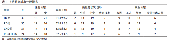 一般情況 各組間性別、年齡、教育程度、職 業(yè)情況差異無(wú)統(tǒng)計(jì)學(xué)意義(P>0.05),在各組基本 平均分布。見(jiàn)表1。其中CHD組、PD+CHD組患者的血 壓、BMI顯著高于HC組和PD組(P<0.05),而HC組 和PD組之間以及CHD組和PD+CHD組之間的血壓、BMI 差異則無(wú)統(tǒng)計(jì)學(xué)意義(P>0.05)。見(jiàn)表2。CAL除HC組與CHD組間差異無(wú) 統(tǒng)計(jì)學(xué)意義外,在其余組間差異均有統(tǒng)計(jì)學(xué)意義 (P<0.05);PD組的CAL值最高,HC組和CHD組最低。 所有組間PPD差異均有統(tǒng)計(jì)學(xué)意義(P<0.05);PD+ CHD組、PD組、CHD組、HC組依次下降。除HC組與 CHD組間、PD組與PD+CHD組間BOP差異無(wú)統(tǒng)計(jì)學(xué)意 義外,其余組間BOP差異均有統(tǒng)計(jì)學(xué)意義(P<0.05); PD組、PD+CHD組高于HC組和CHD組。見(jiàn)表2。