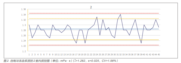 先將SA-7000血流變儀進行日常的維護、清洗和保養(yǎng), 對血漿黏度做定標校準,取上述兩份分別編號為質(zhì)控1和質(zhì) 控2的自制冷凍新鮮血漿各5mL,二者各重復測定20次,經(jīng) 過統(tǒng)計學處理,分別計算出它們的均值x及標準差s,作為 各自的靶值及靶值范圍。隨后每天取自制冷凍血漿質(zhì)控1和 質(zhì)控2各一支,置于37?C水浴箱中溫浴約15min,使其復溶 后立即取出。然后二者與當天常規(guī)標本一同檢測得出結(jié)果并 記錄。自制室內(nèi)質(zhì)控連續(xù)開展45個工作日并同時繪制質(zhì)控 圖表,觀察分析結(jié)果。