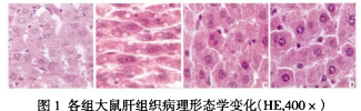 取血后 , 即 刻取出 肝臟 , 取 部分肝組織用 1 0 %甲 醛 固定 , 常規(guī)石蠟包埋 切片 , HE 染色 , 光學(xué)顯微鏡下觀察 。