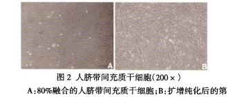 經(jīng)醫(yī)院 醫(yī)學(xué)倫理委員會 批準(zhǔn)。 經(jīng)過產(chǎn)婦知 情同 意后 , 采集正常 足 月 剖宮產(chǎn) 健康胎兒臍帶組織 , 置人 Ha nk ’ s 液 , 4 尤保存 。 在 超凈 臺 內(nèi) 取 出 胳帶 , 用 PB S 沖洗血液 , 用 手術(shù) 刀剔 除胳 帶 內(nèi)血管 , 將臍帶剪成 1  ̄ 2 _3 組織塊 , 放 人培養(yǎng)瓶 , 加人 I I 型 膠原酶消 化 , 過濾 、 收集 細(xì)胞 , 接種在 6 孔板內(nèi) , 置于 C 02 培養(yǎng)箱 內(nèi) 培 養(yǎng)。 96 h 后半量更 換培養(yǎng)液 , 以 后 隔 半天半量換 液 , 顯微鏡 下 觀察 , 大約 1 0 d 后 , 細(xì) 胞融合達(dá)到 8 0 %時 , 進(jìn)行 傳 代培 養(yǎng)。