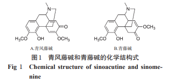 青風(fēng)藤堿(Sinoacutine,結(jié)構(gòu)式見圖1A)為異喹啉類 生物堿,是從防己科千金藤屬云南地不容(Stephania yunnanensis Lo)等多種植物中提取分離而得。研究發(fā) 現(xiàn),青風(fēng)藤堿具有鎮(zhèn)靜、鎮(zhèn)痛、抗炎、抗心律失常等活 性,例如青風(fēng)藤堿能明顯提高小鼠熱板痛閾和足趾電刺 激痛閾,減少醋酸所致的小鼠扭體次數(shù);與戊巴比妥鈉 聯(lián)用后,可增強后者的鎮(zhèn)靜催眠作用;此外,青風(fēng)藤堿 還具有抗Ⅱ型膠原蛋白致大鼠類風(fēng)濕性關(guān)節(jié)炎的作用, 并可明顯降低氯仿致小鼠室顫的發(fā)生率 。本課題組 前期研究發(fā)現(xiàn),青風(fēng)藤堿能明顯縮短氯化鋇致心律失常 模型大鼠恢復(fù)竇性心律所需的時間。