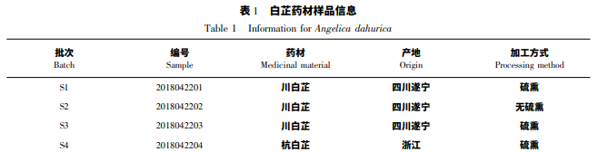 花椒毒酚( 批號: HX106886198) 、異紫花前胡內(nèi) 酯( 批號: HM048527198) 、水合氧化前胡素( 批號: HA061413198) 、白當歸素( 批號: HB157470198) 、補 骨脂 素 ( 批 號: HP018120198 ) 、花 椒 毒 素 ( 批 號: HA061509198) 、佛手柑內(nèi)酯( 批號: HB204394198) 、 氧化前胡素( 批號: HA062924198) 、歐前 胡 素( 批 號: HI041232198 ) 、 異 歐 前 胡 素 ( 批 號: HI041233198) ,以上對照品均購自寶雞辰光生物科 技有限公司,純度 > 98% 。甲醇( 色譜純,美國 Fisher 公司) 、乙腈( 色譜純,美國 Fisher 公司) ,其余為 分析純; 水為屈臣氏純凈水。本實驗搜集了四川、杭 州、安徽、河南、河北等地的白芷藥材樣品,信息見表 1,經(jīng)陜西中醫(yī)藥大學陜西省中藥資源產(chǎn)業(yè)化協(xié)同創(chuàng) 新中心劉世軍副教授鑒定,為白芷 Angelica dahurica ( Fisch. ex Hoffm. ) Benth. et Hook. F 或 杭 白 芷 A. dahurica( Fisch. ex Hoffm. ) Benth. et Hook. F. var. formosana ( Boiss. ) Shan et Yuan 的干燥根,其中 S1、 S3、S4、S7 批次為硫磺熏蒸過的白芷樣品,S2、S5、 S6、S8、S9、S10 批次為無硫磺熏蒸過的白芷樣品。