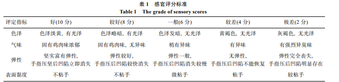冷鮮雞的表觀狀態(tài)由 10 名專業(yè)人員評(píng)判, 評(píng)判標(biāo)準(zhǔn) 見(jiàn)表 1。從色澤、氣味、表面黏度和彈性 4 方面對(duì)冷鮮雞 進(jìn)行評(píng)分, 然后將 4 項(xiàng)分值相加, 10 人評(píng)判平均值為最終 試驗(yàn)結(jié)果, 最終得分 30 分以上表示一級(jí)新鮮, 20 分以上表 示二級(jí)新鮮, 8 分以下表示已經(jīng)完全腐敗, 不宜食用。