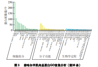 以UniProt/Swiss-Prot蛋白數(shù)據(jù)庫(kù)為背景,對(duì)總蛋白 進(jìn)行鑒定,初步建立察哈爾羊蛋白質(zhì)表達(dá)譜。由圖1可 知,1%假陽(yáng)性條件下,背最長(zhǎng)肌和臀肌中共檢測(cè)到蛋白 質(zhì)1 073 個(gè),其中背最長(zhǎng)肌中共檢測(cè)到877 個(gè),臀肌中共 檢測(cè)到897 個(gè),2 個(gè)部位的總蛋白數(shù)量相近。對(duì)察哈爾羊肌肉總蛋白進(jìn)行GO組分富集分析,由 圖2可知:在細(xì)胞組分中,富集于細(xì)胞外外泌體中的蛋白 質(zhì)數(shù)量最多,其次富集于細(xì)胞質(zhì)內(nèi)的蛋白質(zhì)數(shù)量較多; 在分子功能中,蛋白質(zhì)主要參與聚RNA結(jié)合、ATP結(jié)合 和鈣離子結(jié)合等功能;在生物學(xué)過程中,蛋白質(zhì)主要參 與三羧酸循環(huán)、蛋白質(zhì)結(jié)合和細(xì)胞氧化還原穩(wěn)態(tài)等生物 學(xué)過程。